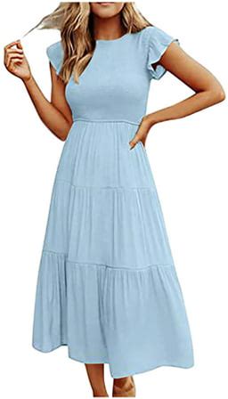 Women's Smocked Sundress Casual Square Neck Sleeveless Ruffle Tiered Midi Dress, Size: Medium, White