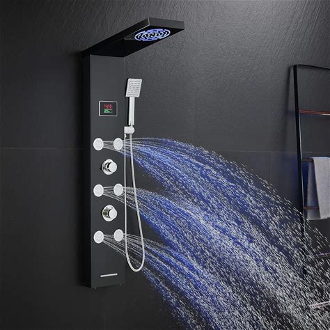 DELAVIN Shower Panel Stainless Steel Shower Tower, 5-Function Shower Panel Tower System, Full Body Shower System With Rainfall Waterfall Massage Body Jets Tub Spout And Handheld Shower, Brushed Black(Brushed Black/5 Body Jets)